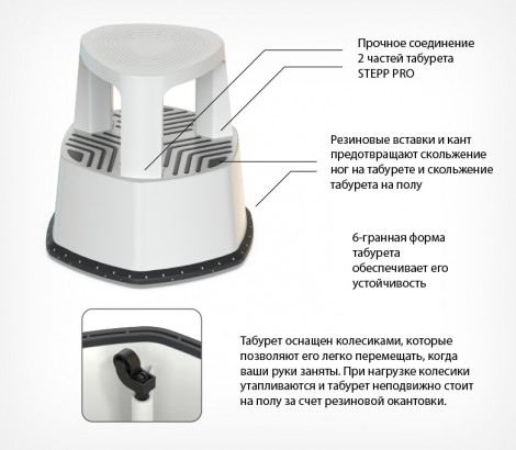 Передвижной табурет-стремянка STEPP PRO позволяет без труда добираться до полок, расположенных выше человеческого роста. Особенности: оснащён колёсиками, с помощью которых табурет легко передвигать, даже если руки заняты имеет резиновую окантовку и вставки, что предотвращает скольжение табурета на полу и скольжение ног на табурете подходит для использования в магазинах, аптеках, на складах, в офисах, а также дома или в гараже. Характеристики: высота: 440 мм максимальная нагрузка: 150 кг вес: 2,8 кг материал: пластик Табурет поставляется в разобранном виде.