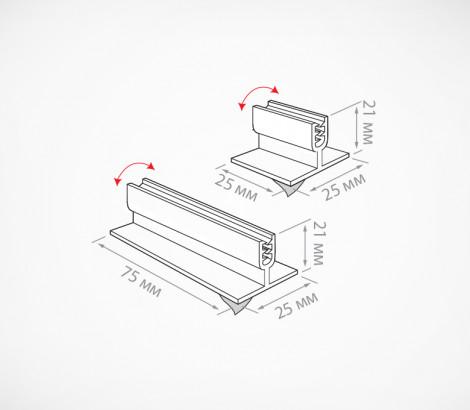 Угловой захват на самоклеящемся основании. Держатель вывесок и основание соединены гибкой ножкой. Подходит для вывесок толщиной от 0,5 до 3 мм. Два варианта длины - 25 и 75 мм.
