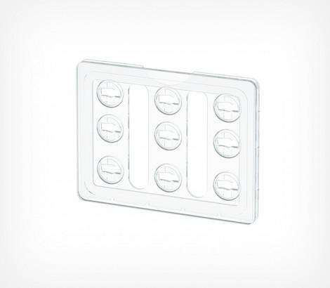 Универсальная рамка-ценникодержатель с 2 гнездами для крепления рамки на разных уровнях относительно полки. Прорезь для вставки по широкой стороне рамки.