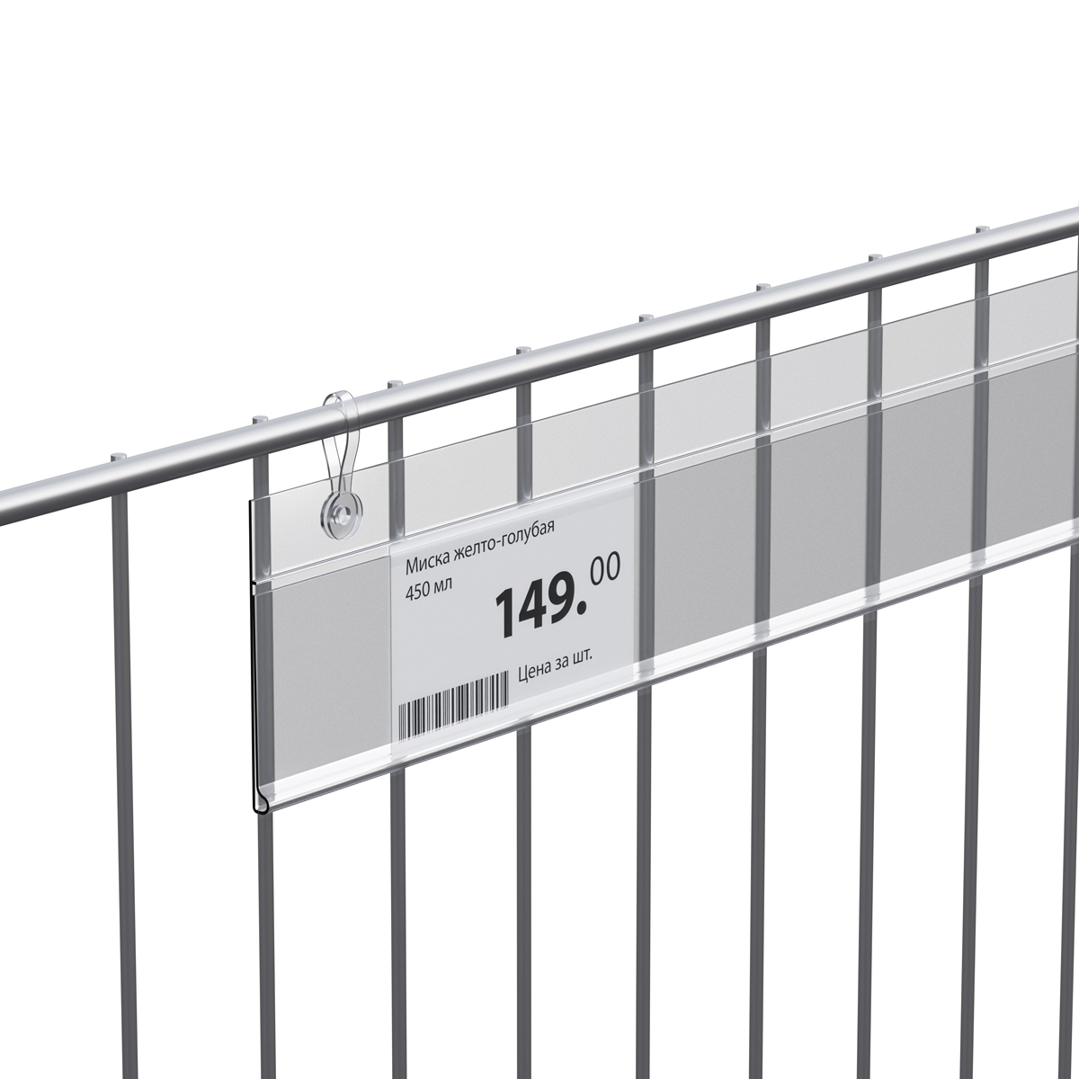 Универсальный ценникодержатель для подвешивания на проволочные корзины с помощью клипс. На профиле длиной 1000 мм требуется 6 клипс, на профиль длиной 1250 мм требуется 7 клипс.
