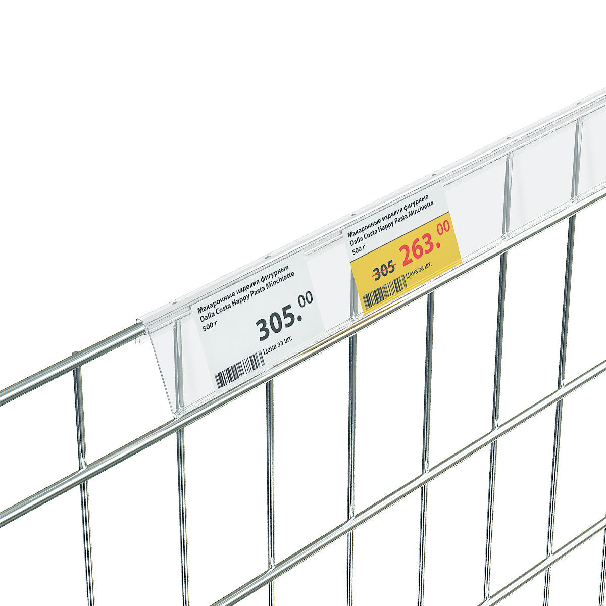 Ценникодержатель предназначен для крепления на корзины и дисплеи из металлической проволоки толщиной 4-8 мм.