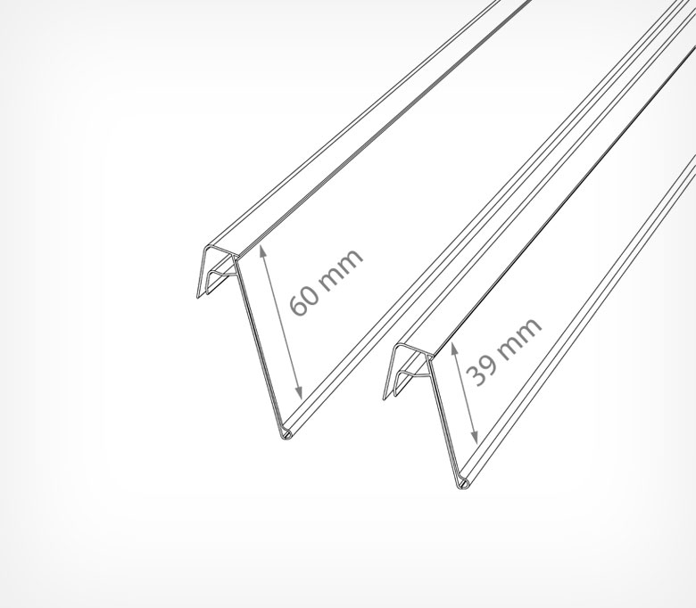 Угол наклона ценника к торцу полки - 60˚.