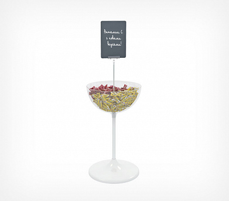 Дисплей состоит из прозрачной пластиковой чаши объемом 24 литра, металлической опорной «ноги» и устойчивого пластикового основания белого цвета. Чаша для выкладки является цельнолитой, что гарантирует её долгую эксплуатацию.