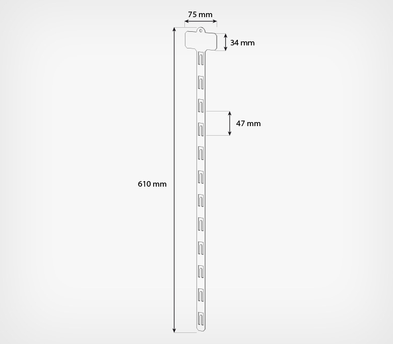 12 пластиковых крючков-фиксаторов расположенных с шагом 47 мм обеспечивают надежное и удобное размещение товаров на ленте. Верхняя часть ленты оснащена топпером для крепления ценников или рекламных наклеек. Дополнительно, в верхней части ленты предусмотрено отверстие для крепления с использованием специального металлического крючка для страйп-лент или хомута.